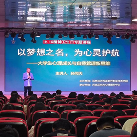 孙闻天教授受邀为北京北大方正软件职业技术学院进行10.10日精神卫生日专题为《以梦想之名,为心灵护航—大学生心理成长与自我管理新思维》的讲座 2024年10月10日是第33个世界精神卫生日,为进一步普及精神卫生和心理健康知识,提高学生心理健康水平,促进学生全面发展和健康成长,我校通识教育中心特别邀请河北省心理咨询师协会副理事长孙闻天教授到校开展心理健康专题讲座,讲座以“共建共治共享 同心健心安心”为主题,全校400余名师生参与了本次活动。 发布时间:2024-10-17 18:17:02